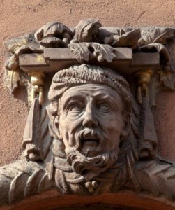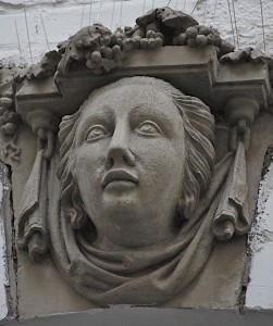 Sur deux façades des Bains figurent par ailleurs quatre mascarons en remploi représentant une Saison et trois Éléments incarnés par des dieux mythologiques. Ils font probablement partie du même ensemble que les trois mascarons réutilisés à la maison À l’Ange de 1901 (voir la notice 15 Faubourg-de-Saverne). Les mascarons diffèrent, par la couleur du grès et par le style, des autres sculptures des Bains et ne font pas partie d’un programme iconographique en rapport avec les Bains, ce qui conforte l’hypothèse de leur remploi.